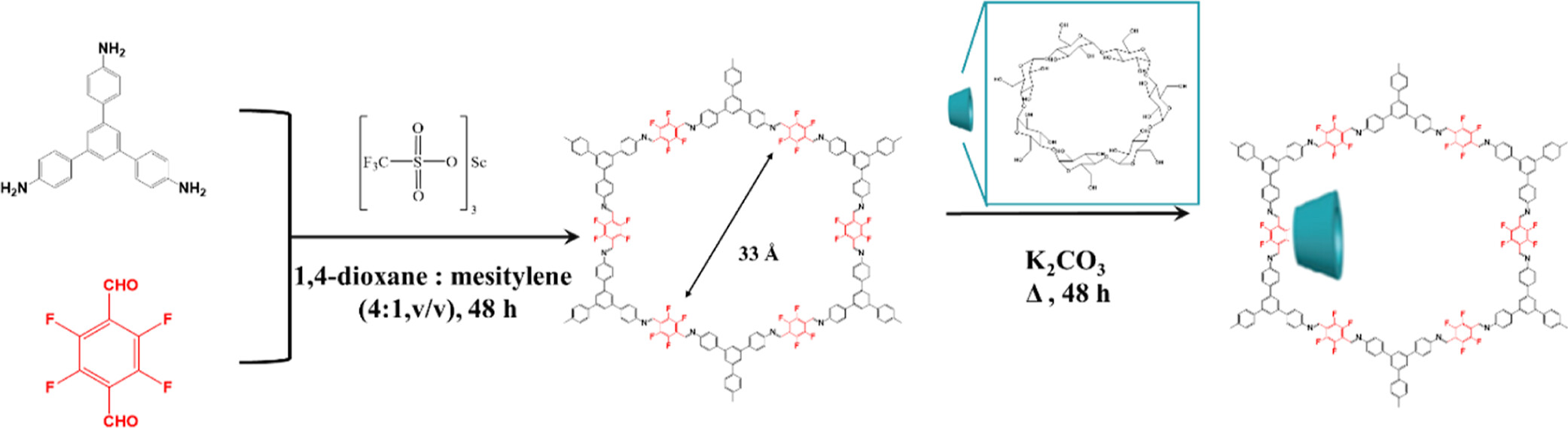 - 将6.7 mg干燥的COF粉末、50 mg β-CD和20 mg无水K2CO3加入Schlenk管中,加入15 mL DMF,通入N2气,85°C下搅拌48小时。