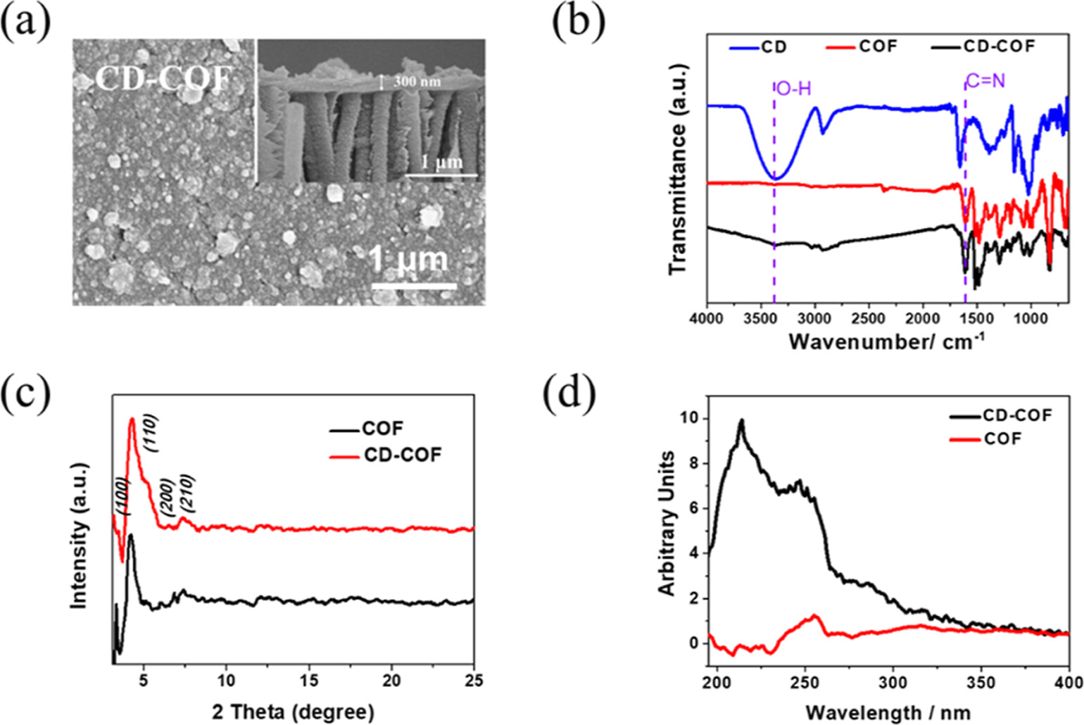 - CD-COF的CD光谱在215 nm处显示出吸收峰,证实了β-CD的成功接枝和其均手性。