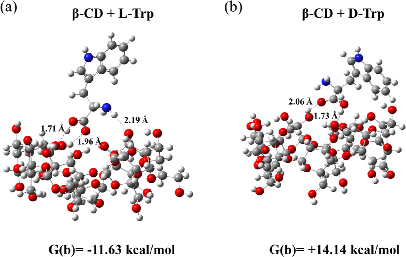 - L-Trp与β-CD的结合能为-11.63 kcal/mol,而D-Trp为+14.14 kcal/mol,表明L-Trp能够更容易地与β-CD位点相互作用。