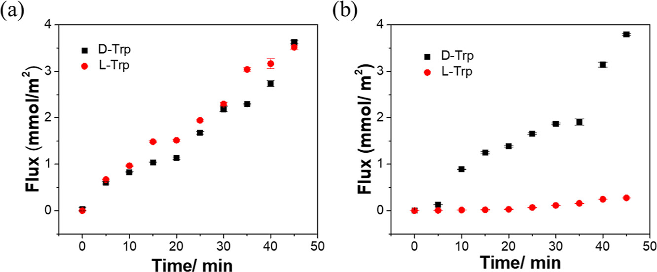 - COF膜对D-Trp和L-Trp的通量几乎相同,而CD-COF膜对L-Trp的通量显著降低,D-/L-Trp选择性为15.3。