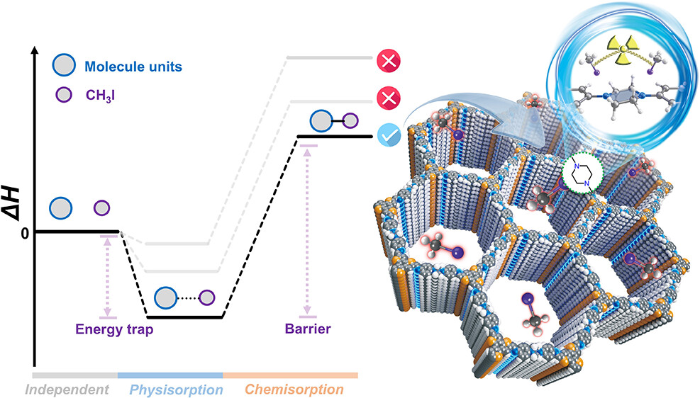 苏州大学陈龙、王殳凹和上海市计量测试技术研究院赵超老师等报道的本篇文章(ACS Cent. Sci. 2024)中设计并合成了一种基于哌嗪的共价有机框架材料(Pip-COF),用于在高流速条件下动态捕获微量的放射性CH3^131I。通过理论计算指导,选择了具有增强对CH3I亲和力的脂肪族sp^3-N基团作为构建单元。实验结果表明,Pip-COF在5 ppm的低浓度和600 mL/min的高流速条件下展现出优异的捕获性能,其饱和容量在75°C时为39 mg/g,在25°C时为78 mg/g,显著优于先前报道的最佳COF材料。此外,Pip-COF在存在NOx气体时仍能保持对CH3^131I的捕获能力,展现了在复杂环境中的应用潜力。