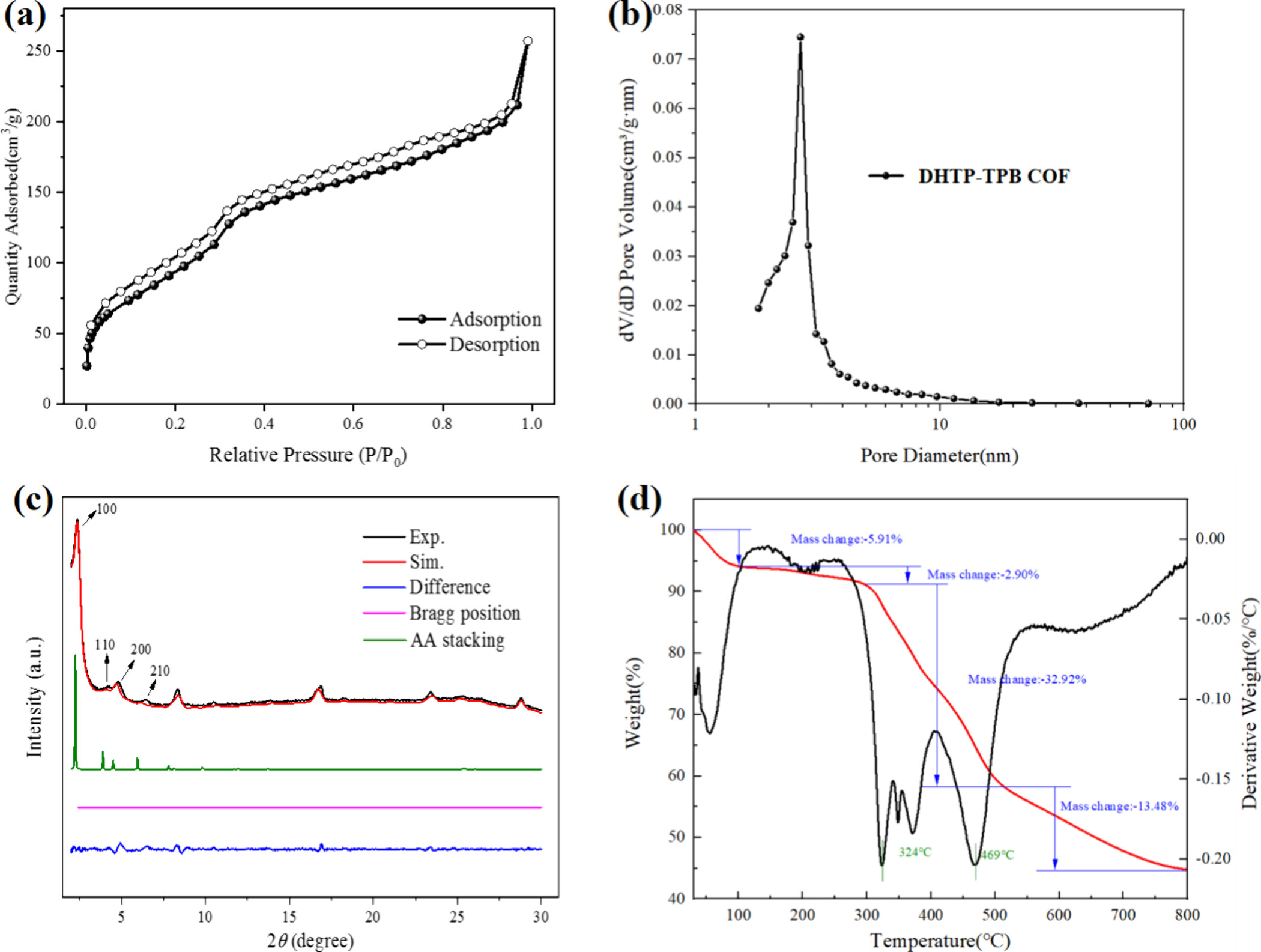 - 结果:DHTP-TPB COF在102-303.2°C范围内表现出良好的热稳定性,失重率为5.9%(25-102°C)和32.9%(303.2-509.2°C)。
