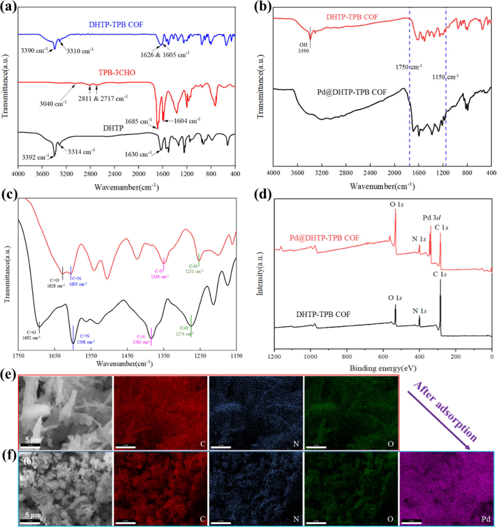- 结果:DHTP-TPB COF的FT-IR光谱显示了C=O和C-N键的振动,表明形成了席夫碱(C=N)结构。
