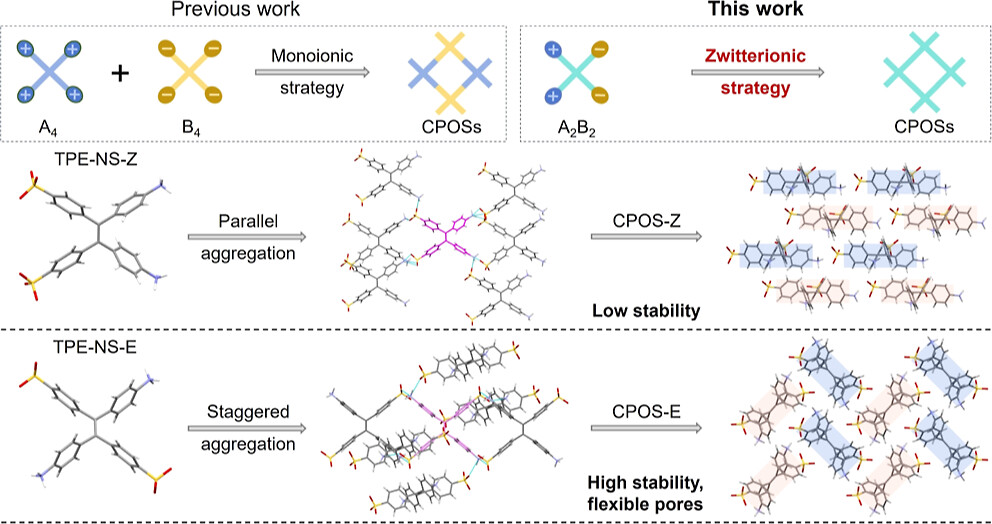 2) 现有解决方案:以往的研究中,CPOSs的构建主要依赖于单离子策略,即通过两种带有相反电荷的构建单元通过离子相互作用形成多孔结构,但这种方法在合成上较为复杂。