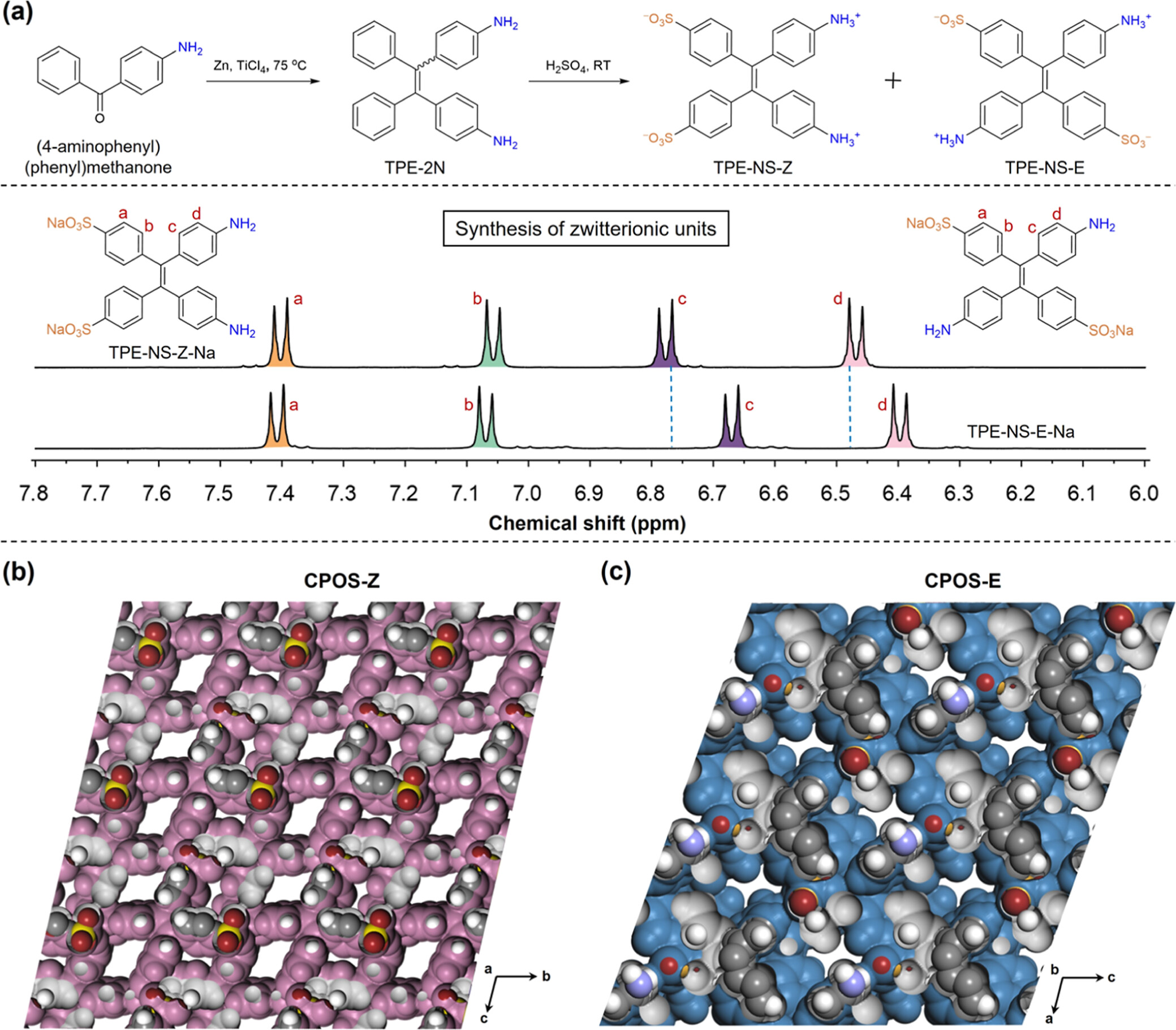 2) 实验结果:通过^1H NMR可以区分顺反异构体,TPE-NS-Z在c和d位置显示出更高的化学位移。单晶分析显示CPOS-Z和CPOS-E都展现出了良好定义的孔道结构,DMSO客分子占据了孔道。
