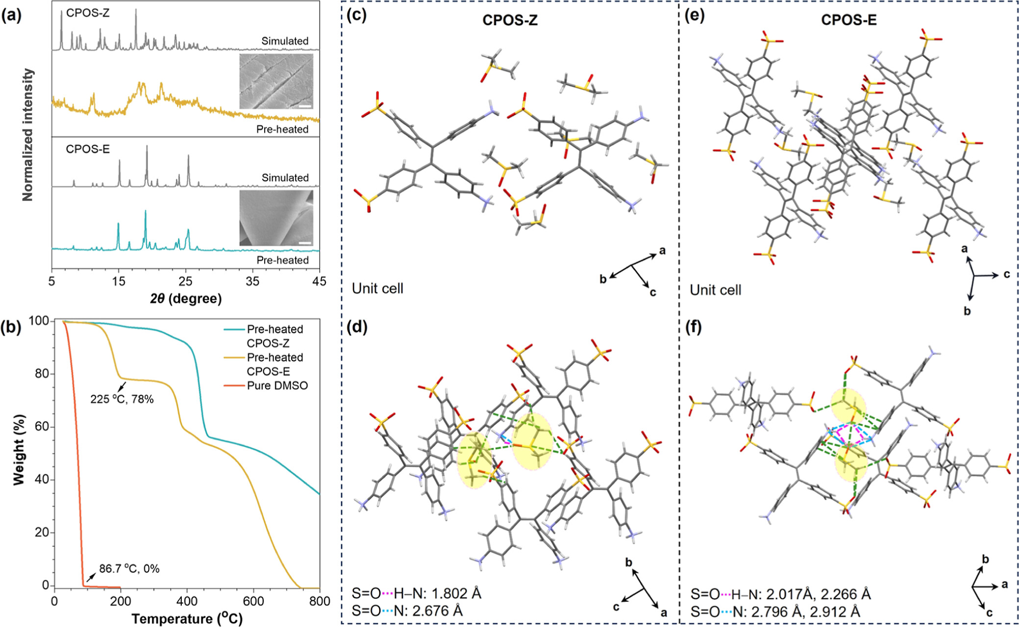 2) 实验结果:CPOS-E保持了有序的晶体结构,而CPOS-Z表现出明显的风化现象。CPOS-E在预热后的TGA测试中显示出明显的重量损失,表明其在加热过程中没有DMSO蒸发,而CPOS-Z则表现出较差的热稳定性。