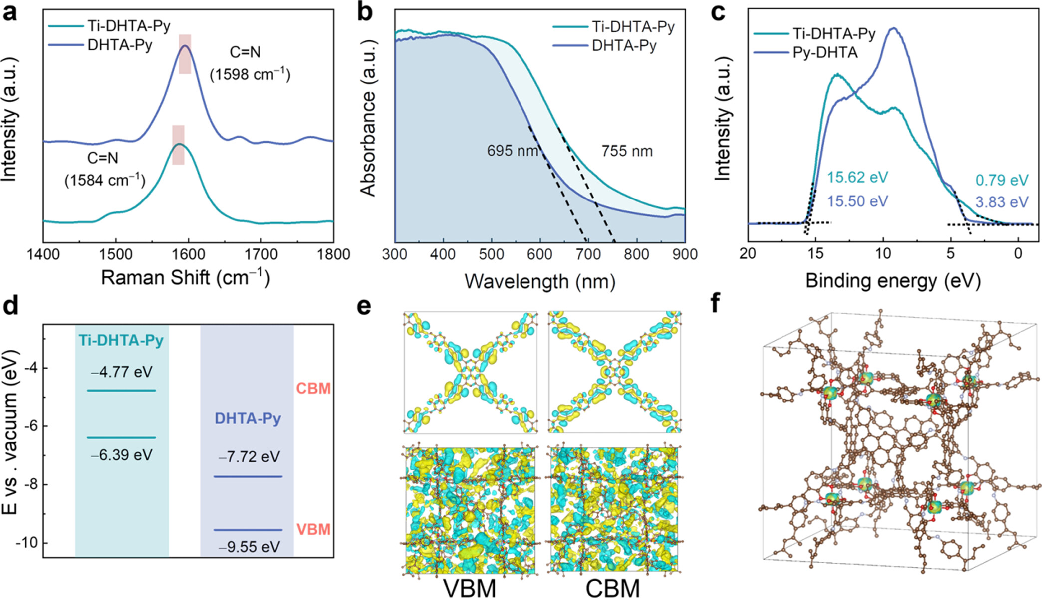 1) Ti-DHTA-Py和DHTA-Py在可见光区域有强吸收,Ti-DHTA-Py的吸收峰红移,表明Ti与配体之间的配位作用。