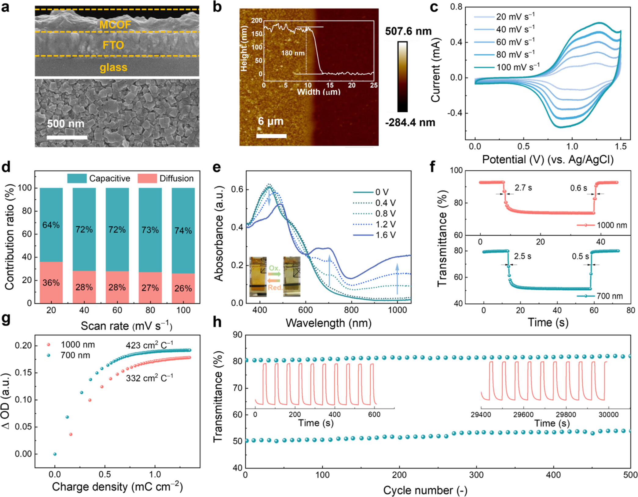 2) 在700 nm处,Ti-DHTA-Py薄膜在250个红氧循环后保持了超过99.2%的初始ΔT,在500个循环后保持了93.6%。