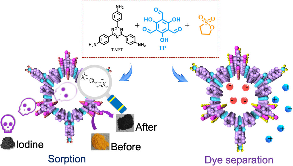 本文成功合成了TATP-COF,并研究了其对碘的吸附性能和对染料的选择性吸附。TATP-COF具有优异的碘吸附容量和去除效率,且可以轻松后修饰为SO3H-TATP-COF,展现出对染料的选择性吸附。这些特性使得TATP-COF成为环境保护和安全领域中净化和分离的候选载体。