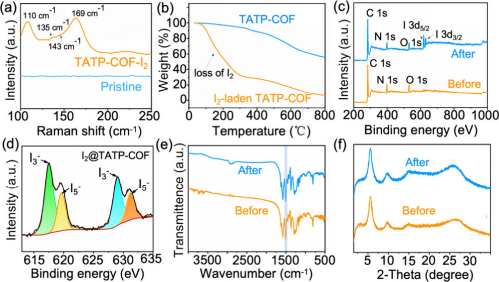 - XPS分析显示碘在TATP-COF中以I3−和I5−的形式存在,与Raman结果一致。