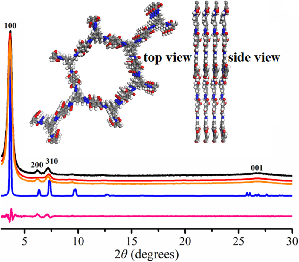 - COF-OH显示出尖锐的衍射峰位于3.68°,归属于(100)晶面的反射,表明COF-OH具有高度结晶性。
