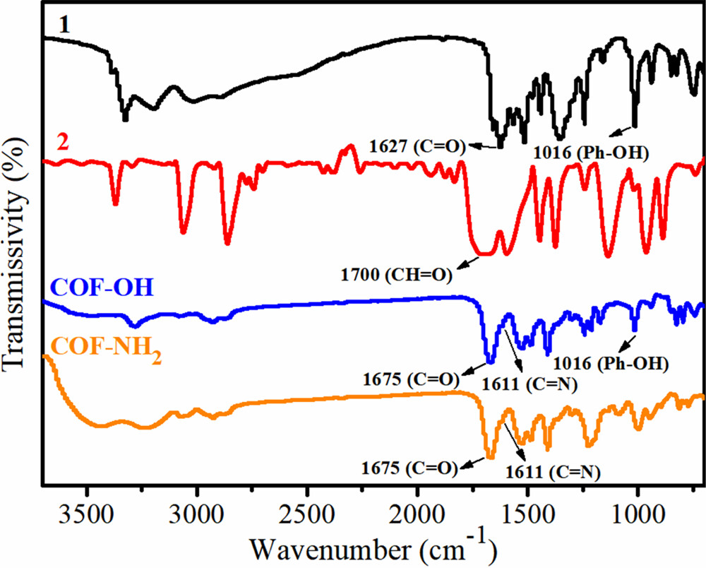 2) 通过COF-OH的后修饰一步法制备COF-NH2。将COF-OH(100 mg)分散在15 mL的乙醇中,加入2-溴乙胺(75 mg)和三乙胺(1.0 mL),在80°C下搅拌1天。混合物冷却至25°C后,通过离心收集COF-NH2,并用去离子水(3 × 10 mL)和乙醇(3 × 10 mL)依次清洗,然后在70°C下干燥6小时,得到淡黄色固体COF-NH2,收率为90%。