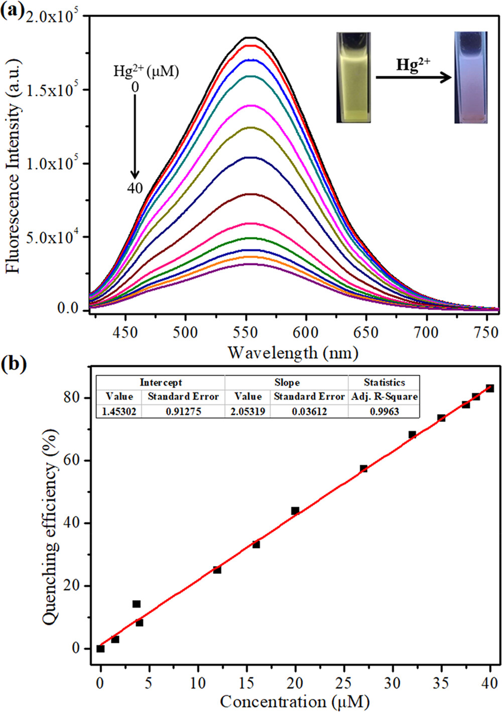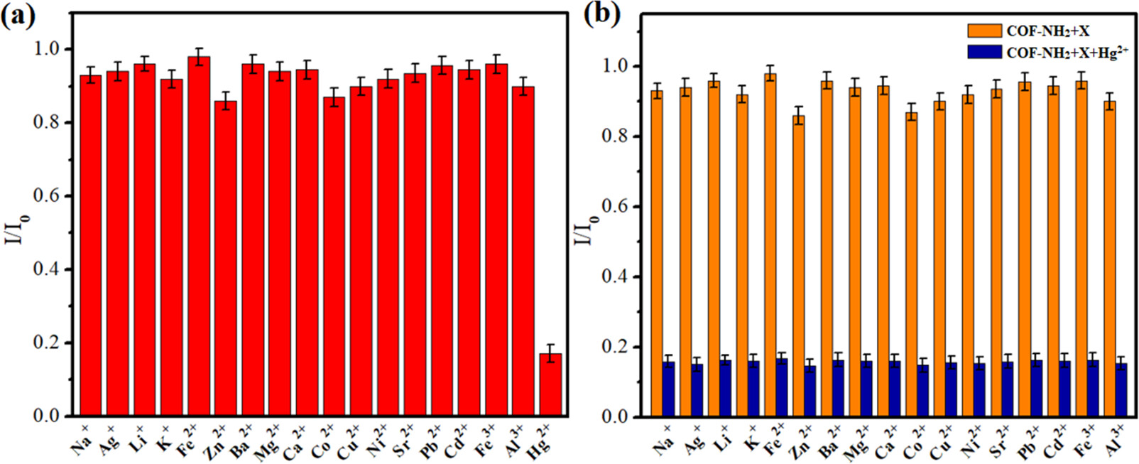 2) 通过逐步添加Hg2+的库存溶液进行荧光滴定。其他金属离子(包括Na+、Ag+、K+、Li+、Fe2+、Fe3+、Zn2+、Mg2+、Ba2+、Ca2+、Co2+、Cu2+、Ni2+、Sr2+、Pb2+、Cd2+和Al3+)的2倍量用于评估COF-NH2对Hg2+监测的选择性。